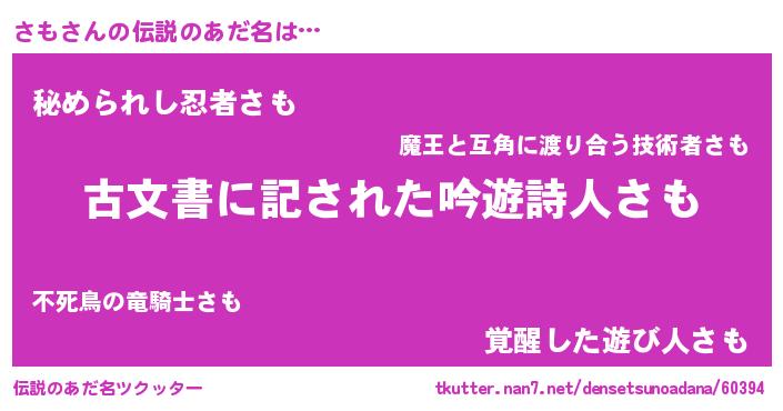 | 男性向けラノベタイトル風あだ名 | 『Re:さもから始める異世界生活』 |