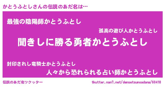 | ヒーロー風カッコイイあだ名 | 『仮面カトダー』『ネオカトウフトシ』 |