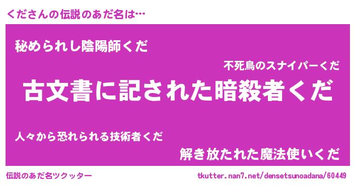 | 男性向けラノベタイトル風あだ名 | 『くだ~年齢イコール彼女いない歴の魔法使い~』 |