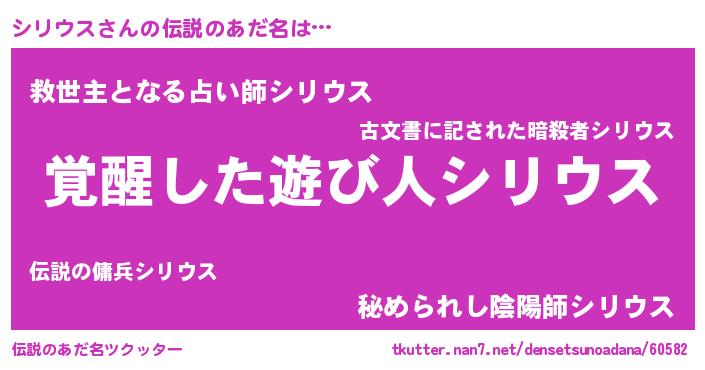 | 女子向けラノベタイトル風あだ名 | 『悪役シリウスに転生したようですが、知った事ではありません』 |