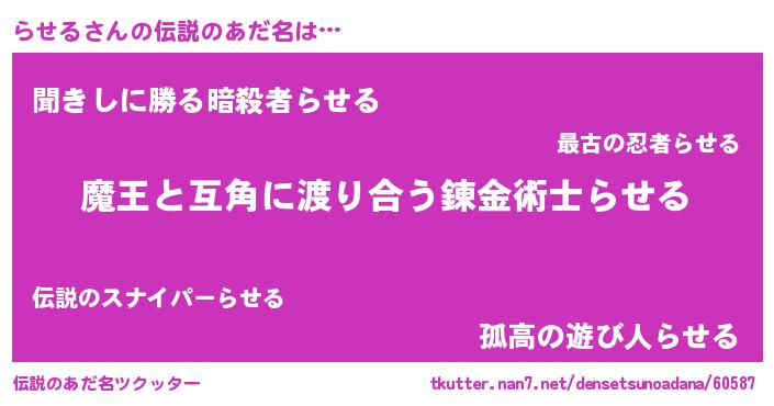| ヒーロー風カッコイイあだ名 | 『慈愛の使者らせる』『ネオラセル』 |