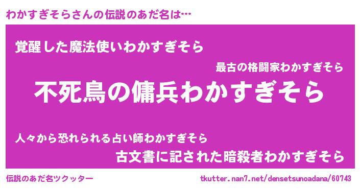 | 男性向けラノベタイトル風あだ名 | 『ワカスギソラアートオンライン』 |