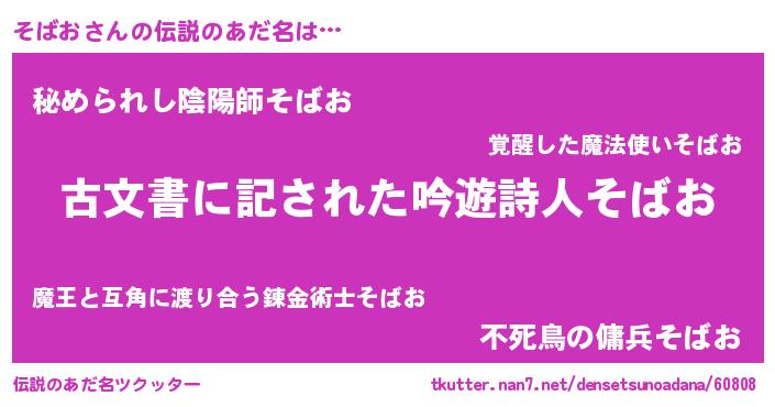 | ヒーロー風カッコイイあだ名 | 『ネオソバオ』『ウルトラそばおマン』 |