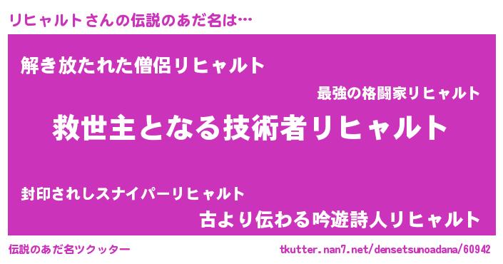 | 男性向けラノベタイトル風あだ名 | 『ノーゲーム・ノーリヒャルト』 |