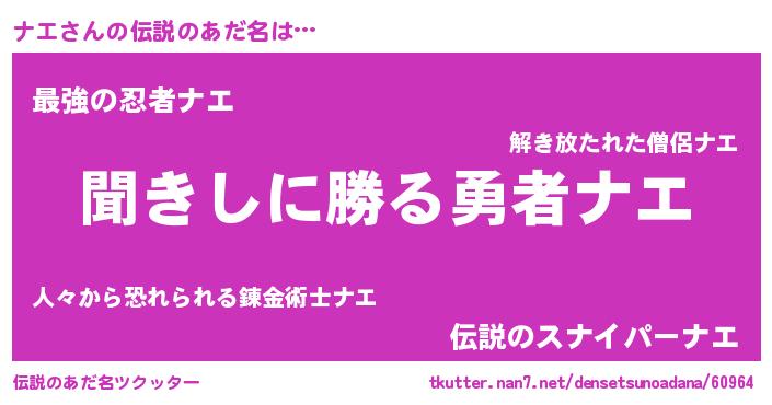 | 男性向けラノベタイトル風あだ名 | 『魔法科高校のナエ』『魔弾の王とナエ』 |