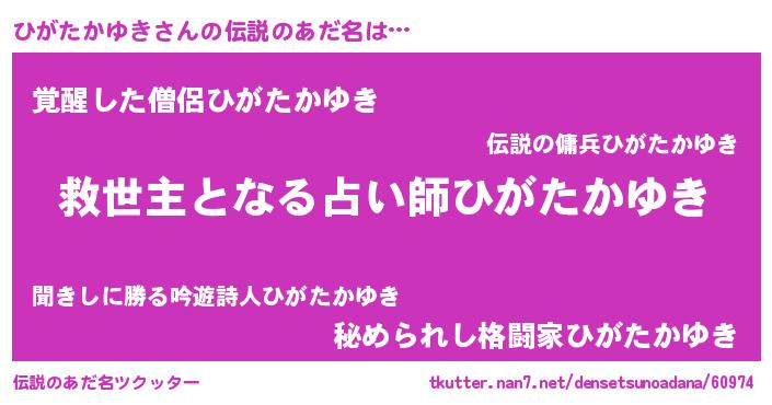 | 男性向けラノベタイトル風あだ名 | 『ノーゲーム・ノーヒガタカユキ』 |