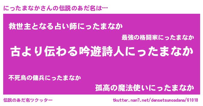 | 男性向けラノベタイトル風あだ名 | 『にったまなかに滅ぼされるだけの簡単なお仕事です』 |