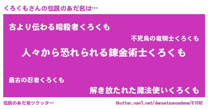 | ヒーロー風カッコイイあだ名 | 『超時空戦士クロクモ』『ネオクロクモ』 |