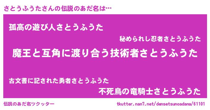 | 男性向けラノベタイトル風あだ名 | 『おまえをオタクにしてやるから、俺をさとうふうたにしてくれ! 』 |