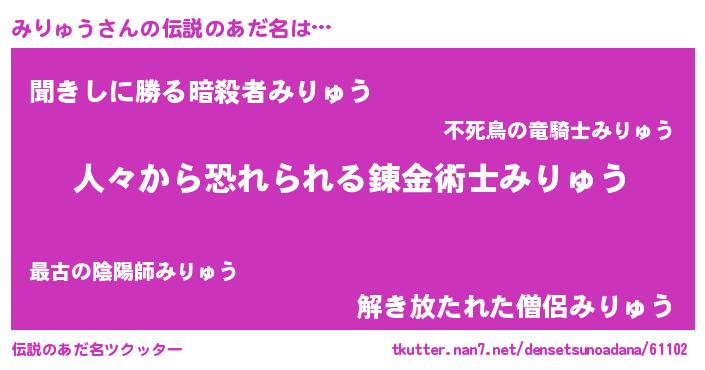 | 男性向けラノベタイトル風あだ名 | 『ミリュウスレイヤー』 |
