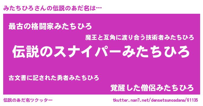 | 男性向けラノベタイトル風あだ名 | 『魔弾の王とみたちひろ』 |