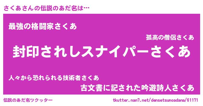 | 男性向けラノベタイトル風あだ名 | 『サクアアートオンライン』 |