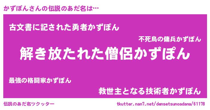 | 女子向けラノベタイトル風あだ名 | 『かずぽんの卵を拾いまして』 |