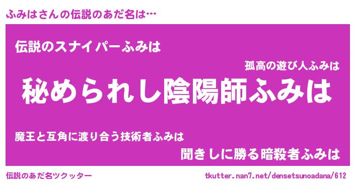 | 意味不明あだ名 | 『ふみはフォーエバー』『自称ふみは』 |
