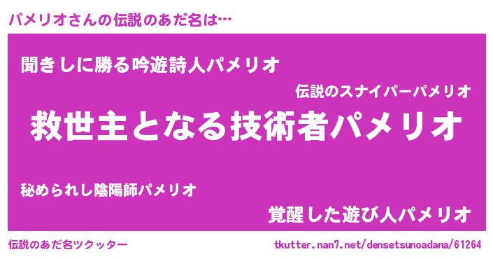 | ヒーロー風カッコイイあだ名 | 『慈愛の使者パメリオ』『ネオパメリオ』 |