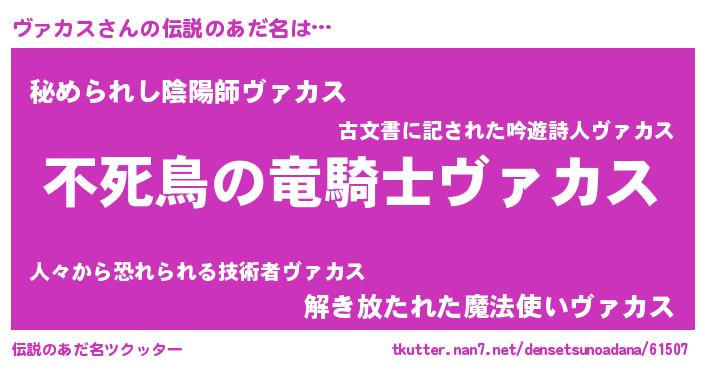 | 男性向けラノベタイトル風あだ名 | 『魔弾の王とヴァカス』『ヴァカスの憂鬱』 |