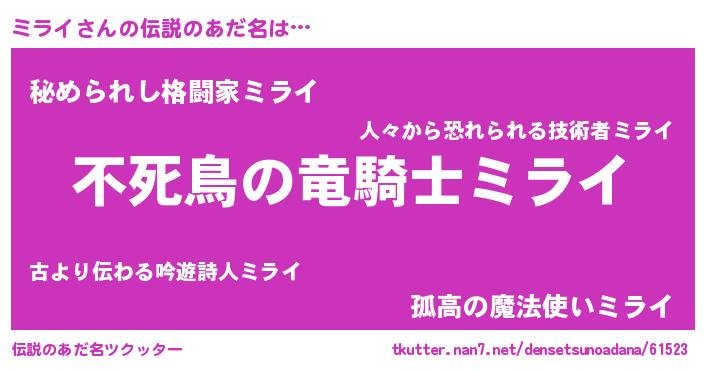 | 意味不明あだ名 | 『住所不定無職ミライ(6歳)』『自称ミライ』 |