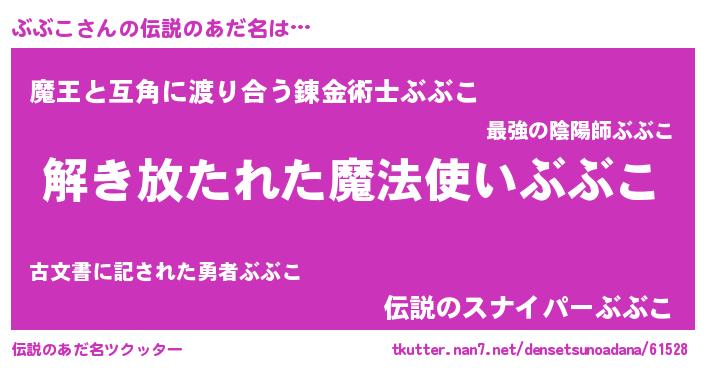 | 女子向けラノベタイトル風あだ名 | 『ぶぶこの卵を拾いまして』 |