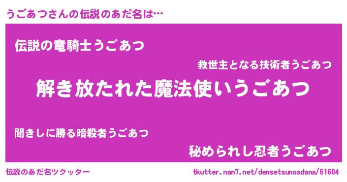 | 意味不明あだ名 | 『自称うごあつ』『ペロリンうごあつ』 |