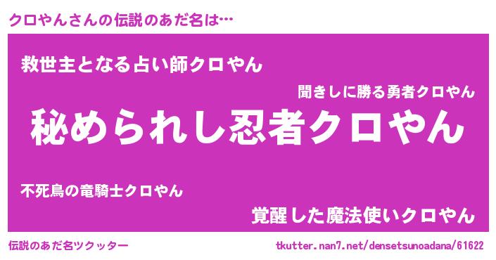 | ヒーロー風カッコイイあだ名 | 『仮面クロダー』『ウルトラクロやんマン』 |