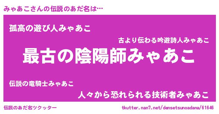 | ヒーロー風カッコイイあだ名 | 『ウルトラみゃあこマン』『銀牙騎士ミャ』 |