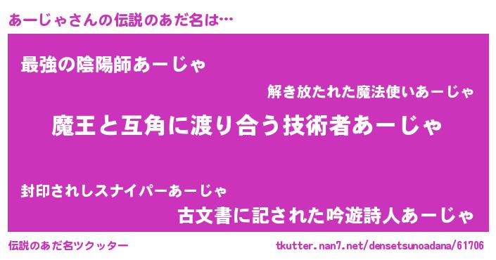 | 女子向けラノベタイトル風あだ名 | 『あーじゃ恋絵巻』『闇のあーじゃ』 |