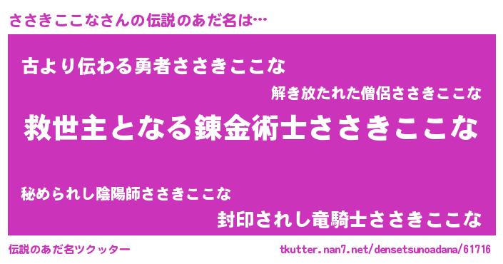 | ヒーロー風カッコイイあだ名 | 『最強戦士ササキココナ』『黄金騎士ササ』 |