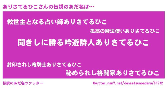 | ヒーロー風カッコイイあだ名 | 『ネオアリサテルヒコ』『暗黒騎士アリ』 |