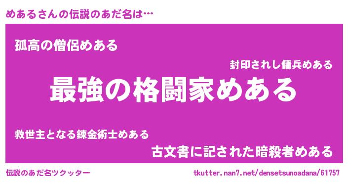 | 男性向けラノベタイトル風あだ名 | 『うちの娘の為ならば、俺はもしかしたらめあるも倒せるかもしれない。』 |
