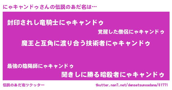 | ヒーロー風カッコイイあだ名 | 『仮面ニャダー』『ネオニャキャンドゥ』 |
