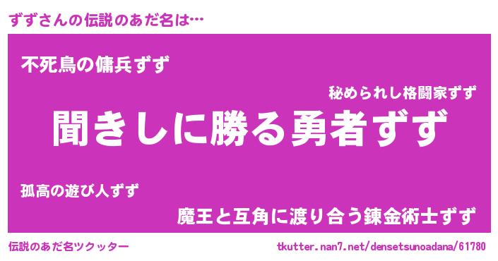 | 男性向けラノベタイトル風あだ名 | 『ずずという概念が存在しない退屈な世界 』 |