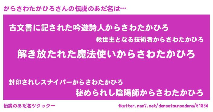 | 胡散臭い通販商品みたいなあだ名 | 『伝統あるサプリメント…その名も「からさわたかひろ」』 |