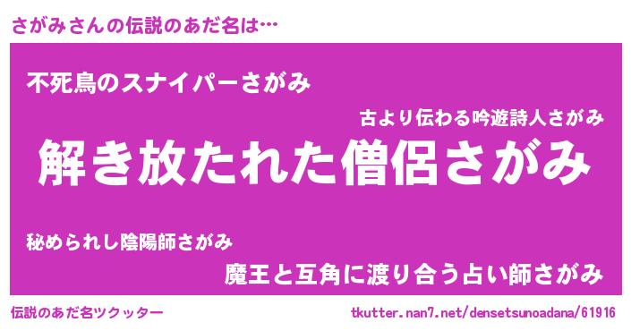 | ヒーロー風カッコイイあだ名 | 『魔戒騎士サガ』『スーパーサガミ』 |