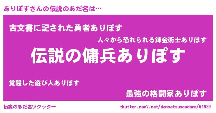 | 意味不明あだ名 | 『自称ありぽす』『ペロリンありぽす』 |