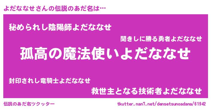 | 胡散臭い通販商品みたいなあだ名 | 『信頼と実績のサプリメント…その名も「よだななせ」』 |