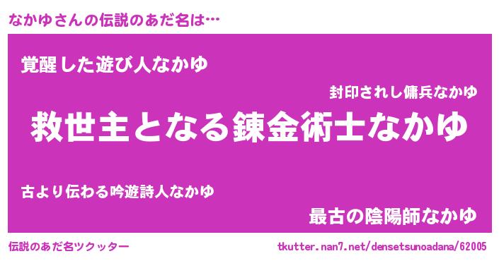 | ヒーロー風カッコイイあだ名 | 『天空の使者なかゆ』『天弓騎士ナカ』 |