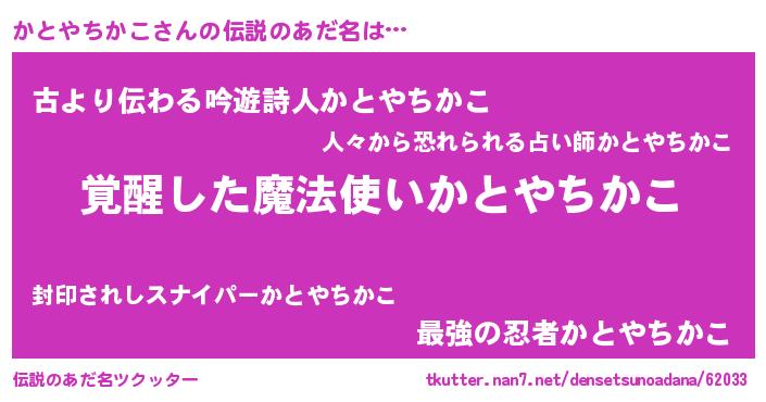 | ヒーロー風カッコイイあだ名 | 『炎刃騎士カト』『ネオカトヤチカコ』 |