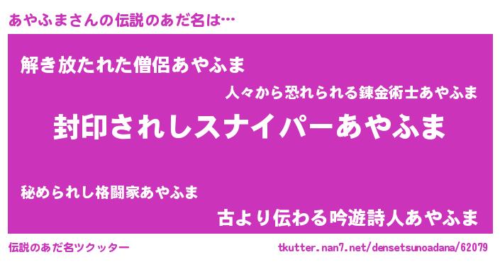 | 意味不明あだ名 | 『ペロリンあやふま』『永久保存あやふま』 |
