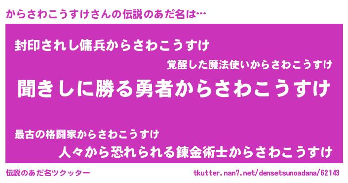 | 男性向けラノベタイトル風あだ名 | 『魔弾の王とからさわこうすけ』 |