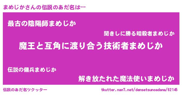 | 男性向けラノベタイトル風あだ名 | 『おまえをオタクにしてやるから、俺をまめじかにしてくれ! 』 |