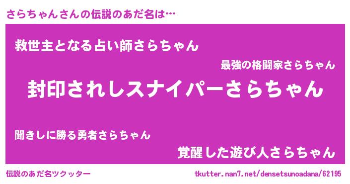 | 男性向けラノベタイトル風あだ名 | 『さらちゃん~年齢イコール彼女いない歴の魔法使い~』 |
