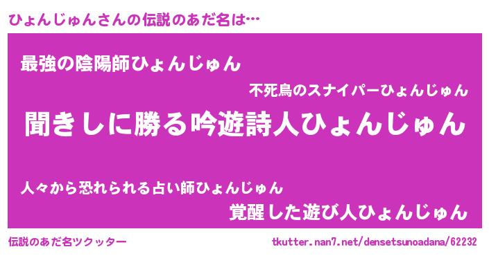 | 男性向けラノベタイトル風あだ名 | 『ひょんじゅんという概念が存在しない退屈な世界 』 |