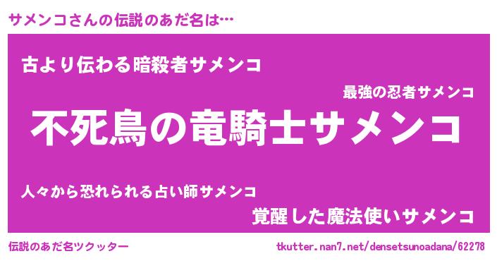 | 意味不明あだ名 | 『もやし科サメンコ属』『自称サメンコ』 |