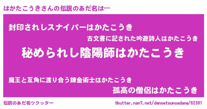| 意味不明あだ名 | 『自称はかたこうき』 |