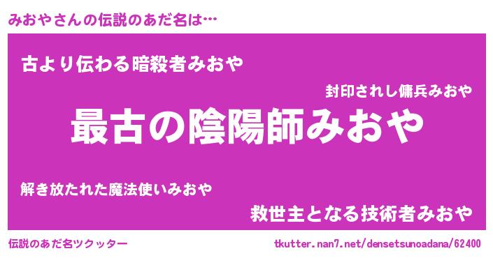 | 意味不明あだ名 | 『たけのこ科みおや属』『自称みおや』 |