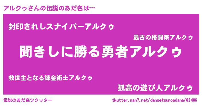 | 男性向けラノベタイトル風あだ名 | 『アルクゥという概念が存在しない退屈な世界 』 |