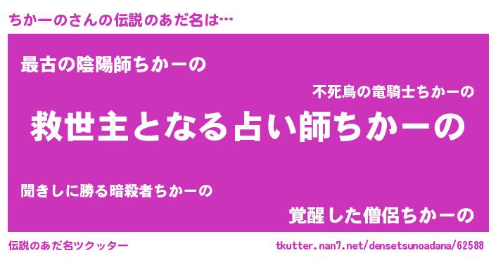 | ヒーロー風カッコイイあだ名 | 『慈愛の使者ちかーの』『天弓騎士チカ』 |