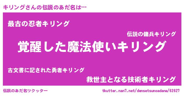 | 男性向けラノベタイトル風あだ名 | 『キリングの嫁は女の子じゃないと思った?』 |