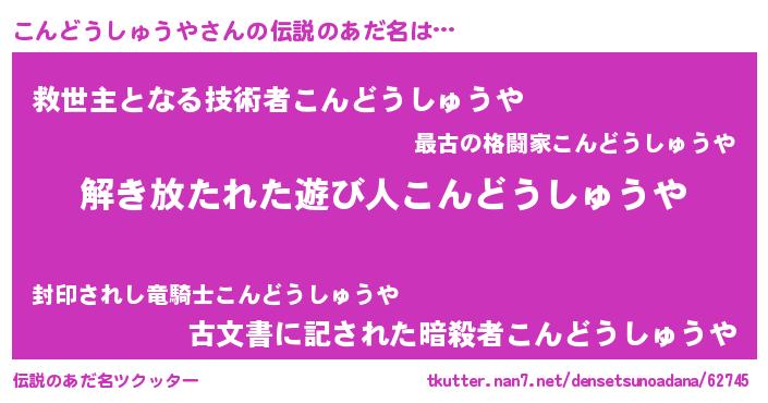 | 意味不明あだ名 | 『住所不定無職こんどうしゅうや(91歳)』 |