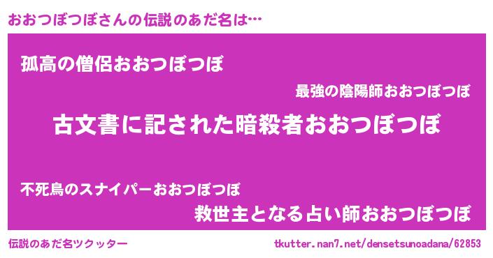 | 男性向けラノベタイトル風あだ名 | 『おおつぼつぼ~年齢イコール彼女いない歴の魔法使い~』 |